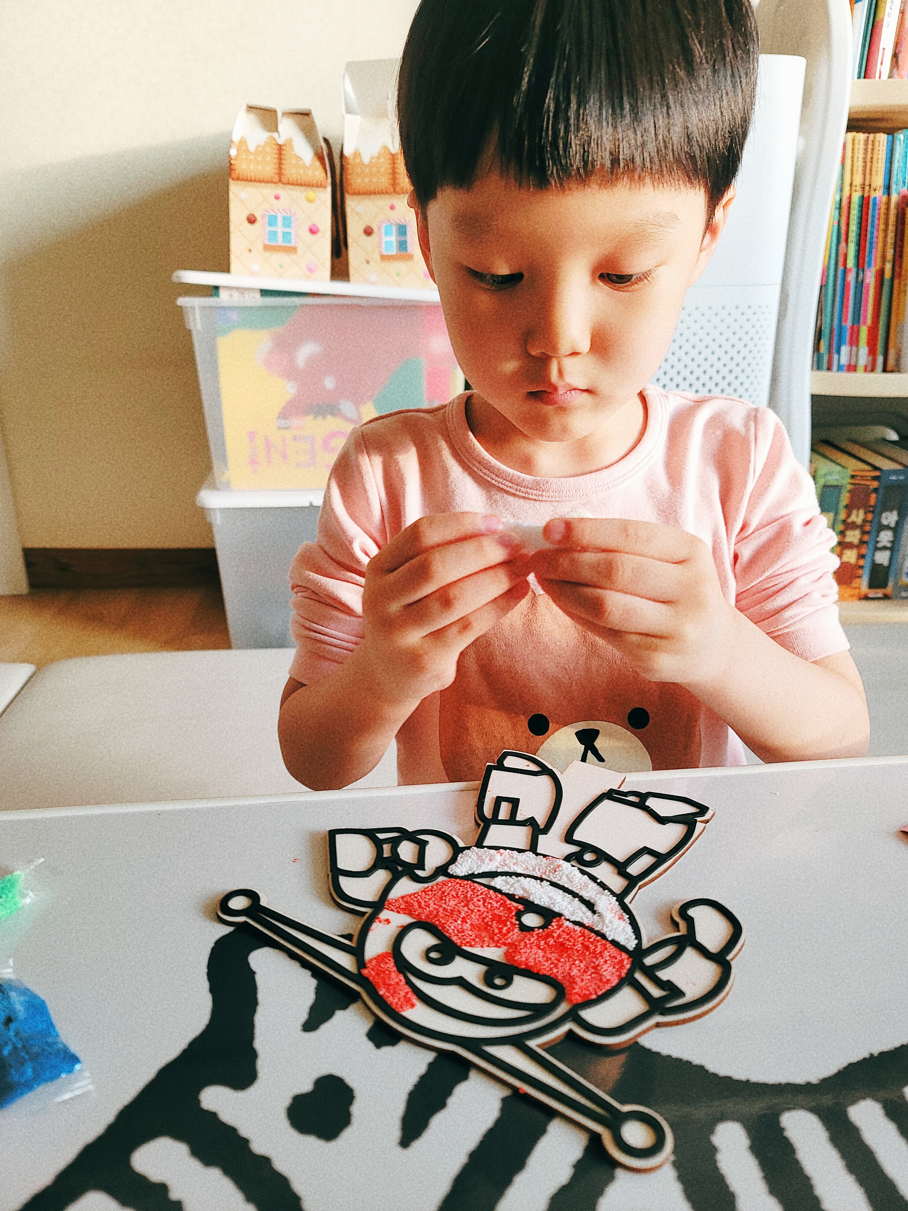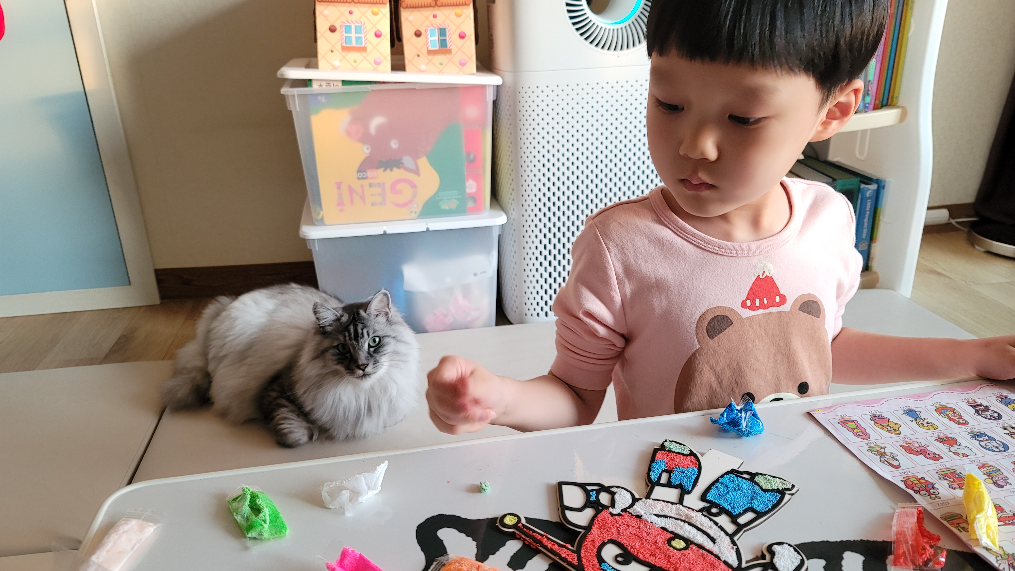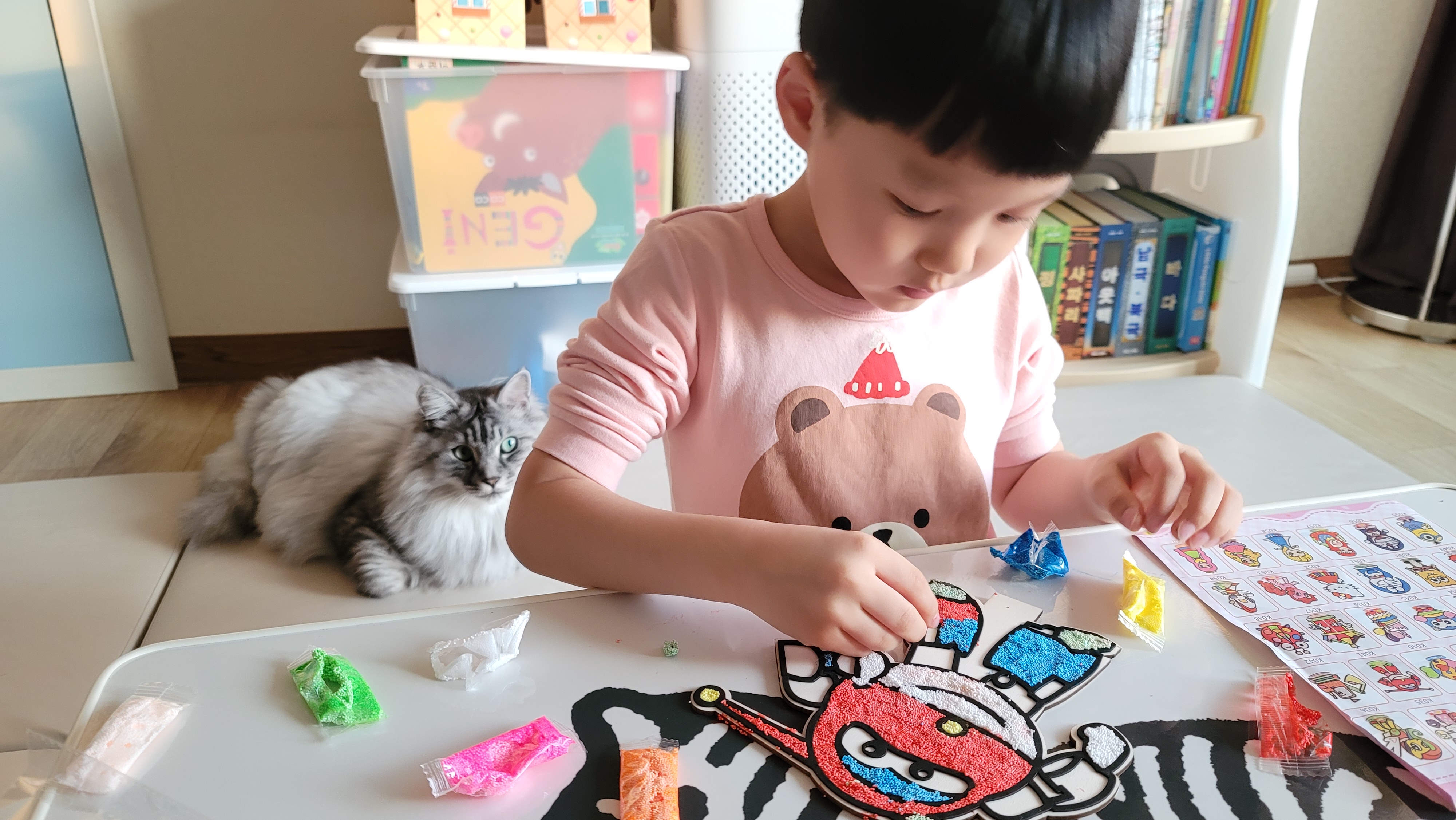 한껏 진지하게 하나씩 채워 넣고 있는 첫째 꼬맹이입니다. 이제 6살이라 그런지 혼자서도 척척 알아서 잘합니다. 가끔 조금 좁은 곳이라서 붙이기 힘들면 "엄마, 도와주세요"라고 하지만, 엄마가 하는 걸 보고 반대쪽은 곧잘 따라 합니다.