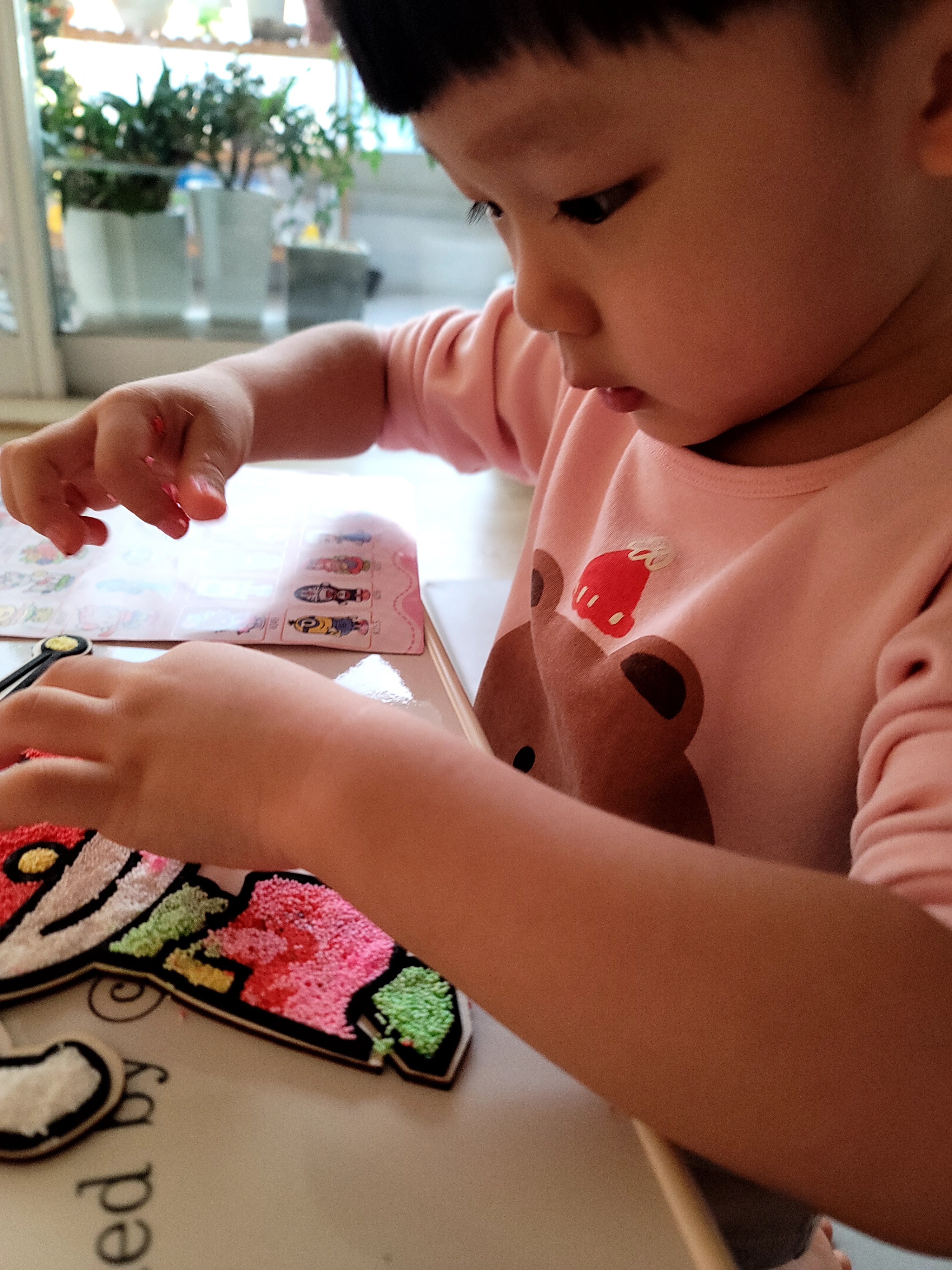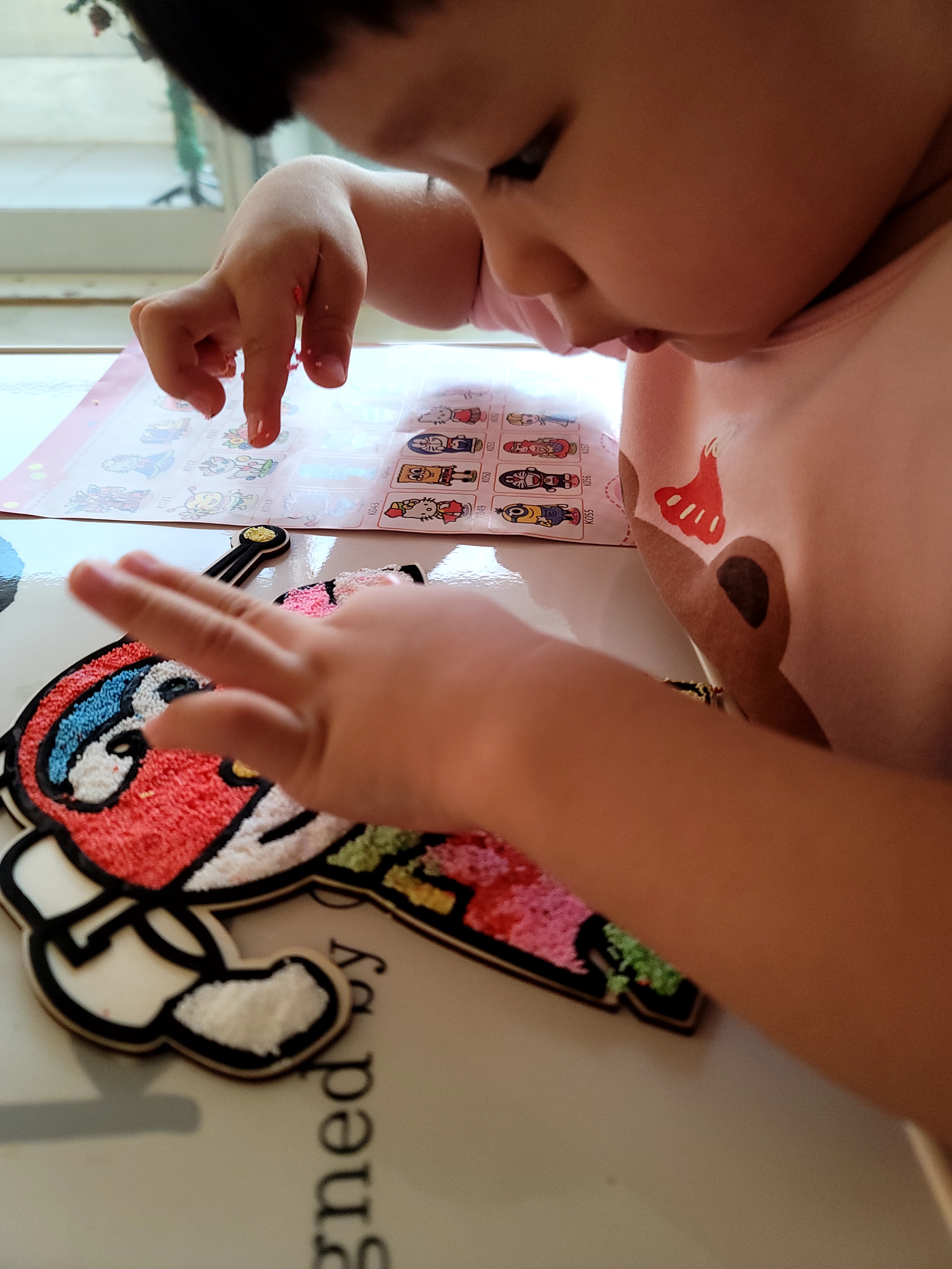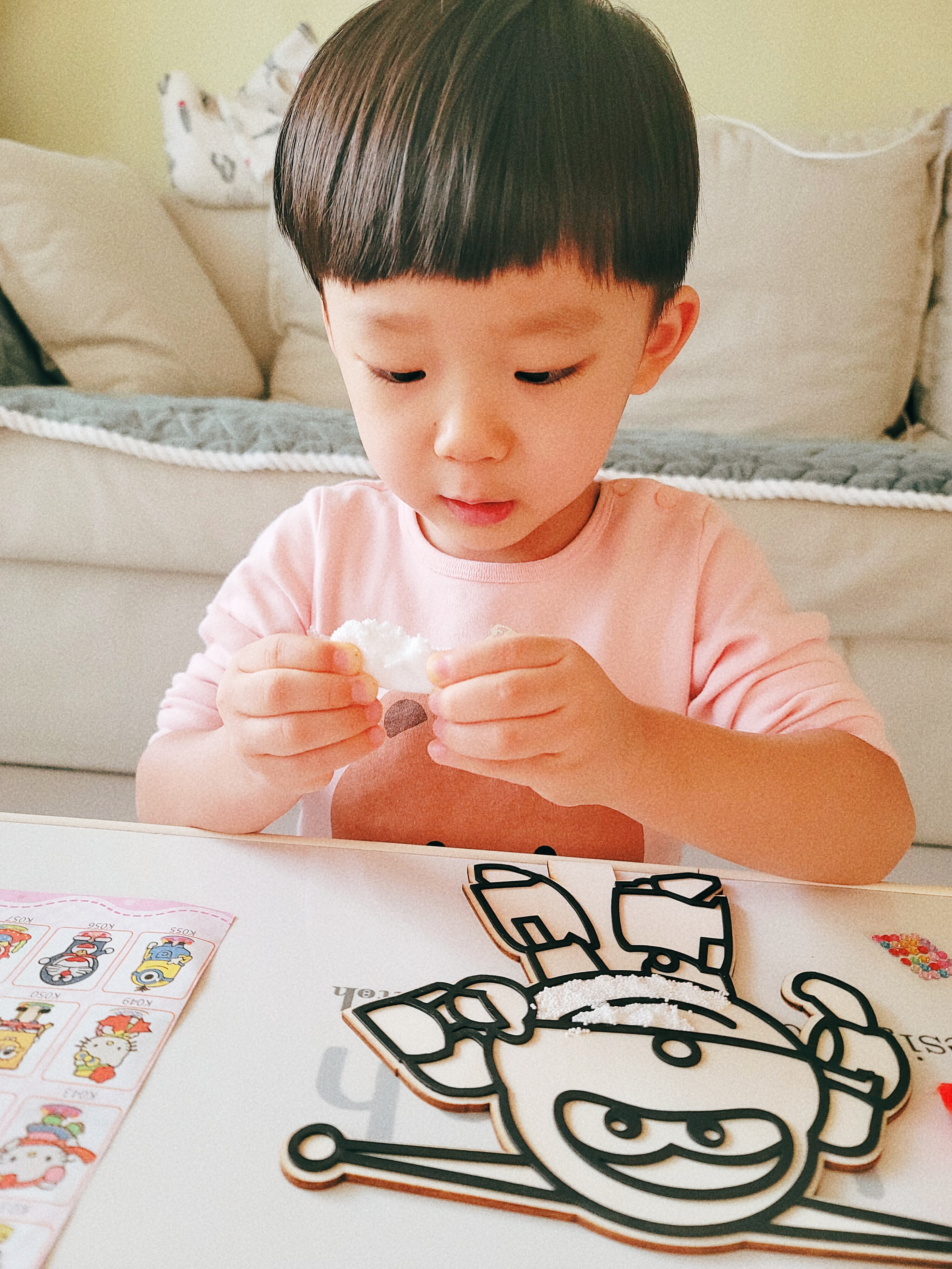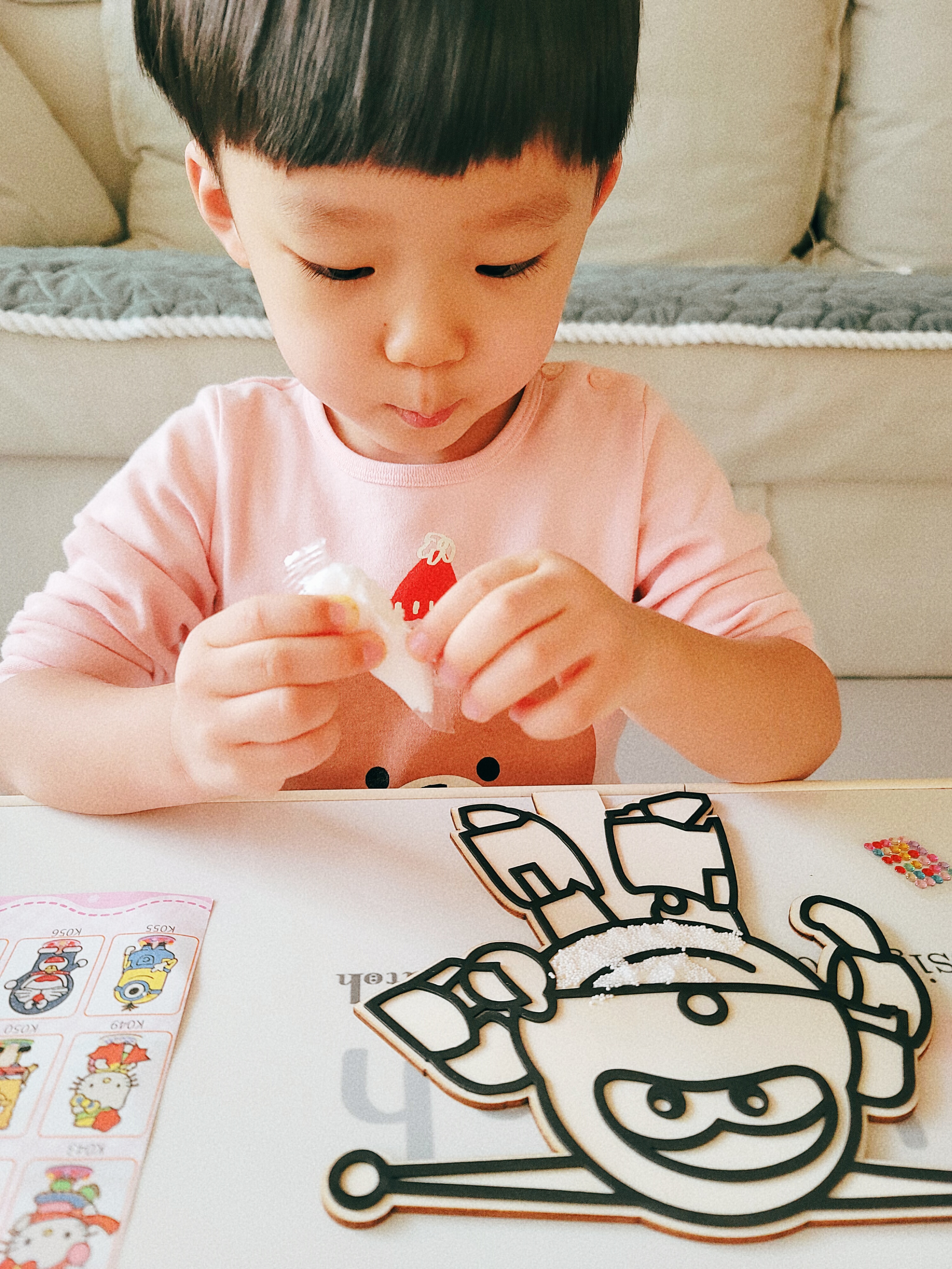 한껏 진지하게 하나씩 채워 넣고 있는 첫째 꼬맹이입니다. 이제 6살이라 그런지 혼자서도 척척 알아서 잘합니다. 가끔 조금 좁은 곳이라서 붙이기 힘들면 "엄마, 도와주세요"라고 하지만, 엄마가 하는 걸 보고 반대쪽은 곧잘 따라 합니다.