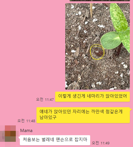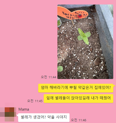 처음에는 벌레가 아니라 무엇이 묻었는지 알았습니다. 식물은 햇빛에 놔두고 물만 주면 자라는 줄 알고 있었기에 벌레가 생길 거라는 생각조차 하지 못했습니다. 벌레가 앉았던 자리의 잎은 거뭇거뭇한 것이 묻어있었고, 잎은 누렇게 변해있었습니다. 직감적으로 '이건 병충해다!'라는 생각이 머리를 스쳐가자마자 안으로 뛰어들어가 인터넷을 검색하기 시작했고, 검색하는 동시에 식물 키우는 것을 좋아하고 많은 꽃들을 키우고 있는 시엄마에게 연락했습니다.