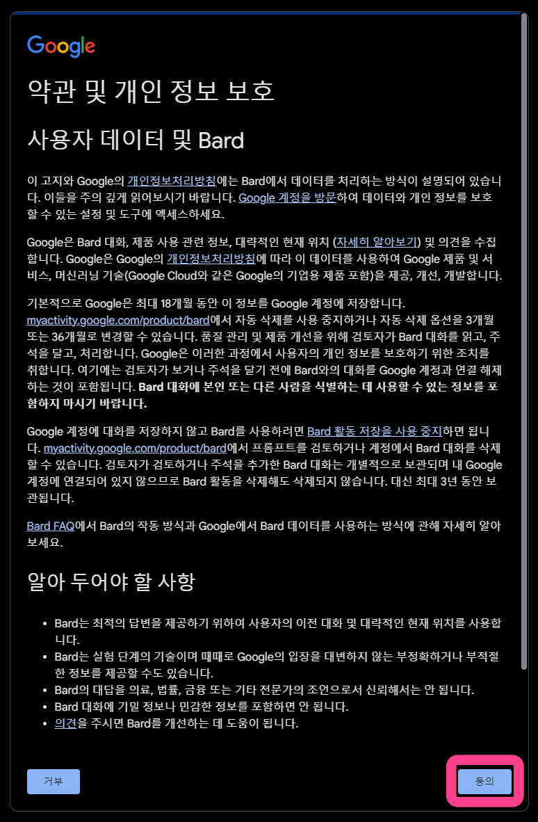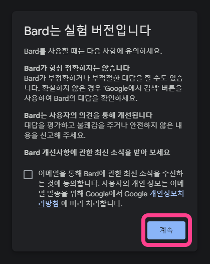 약관을 쭉 내려 [동의] 버튼을 눌러주고, 실험버전에 대한 유의사항을 읽고 [계속] 버튼을 눌러주면 이제 바드를 사용할 수 있습니다.