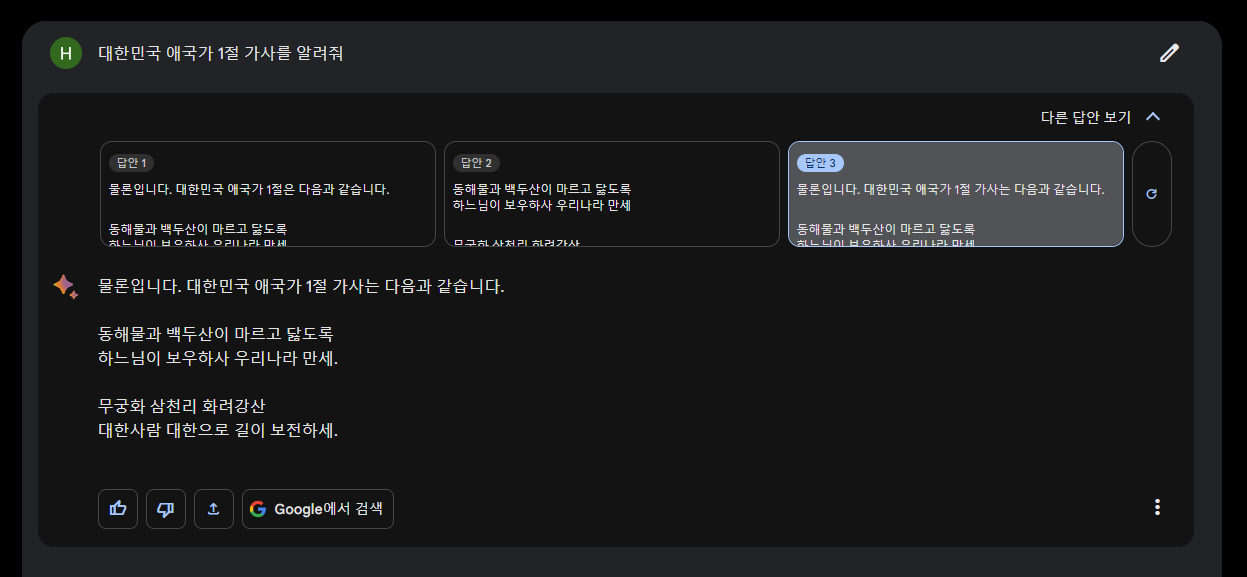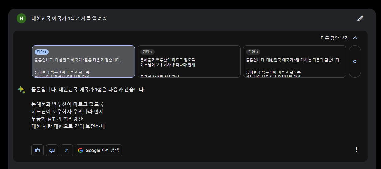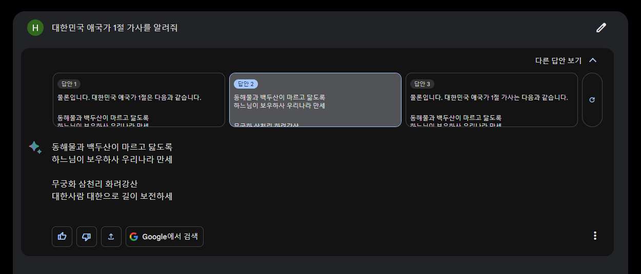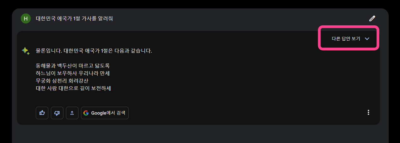 저는 대한민국 애국가 1절 가사를 알려달라고 직접 입력해 보았습니다. 몇 초의 시간이 걸리지 않고 답변을 받았습니다. 물론 애국가 가사와 일치하는 것 또한 확인했습니다. 혹시나 답변이 마음에 들지 않는다면 [다른 답안 보기]를 눌러 다른 답변을 볼 수도 있습니다.