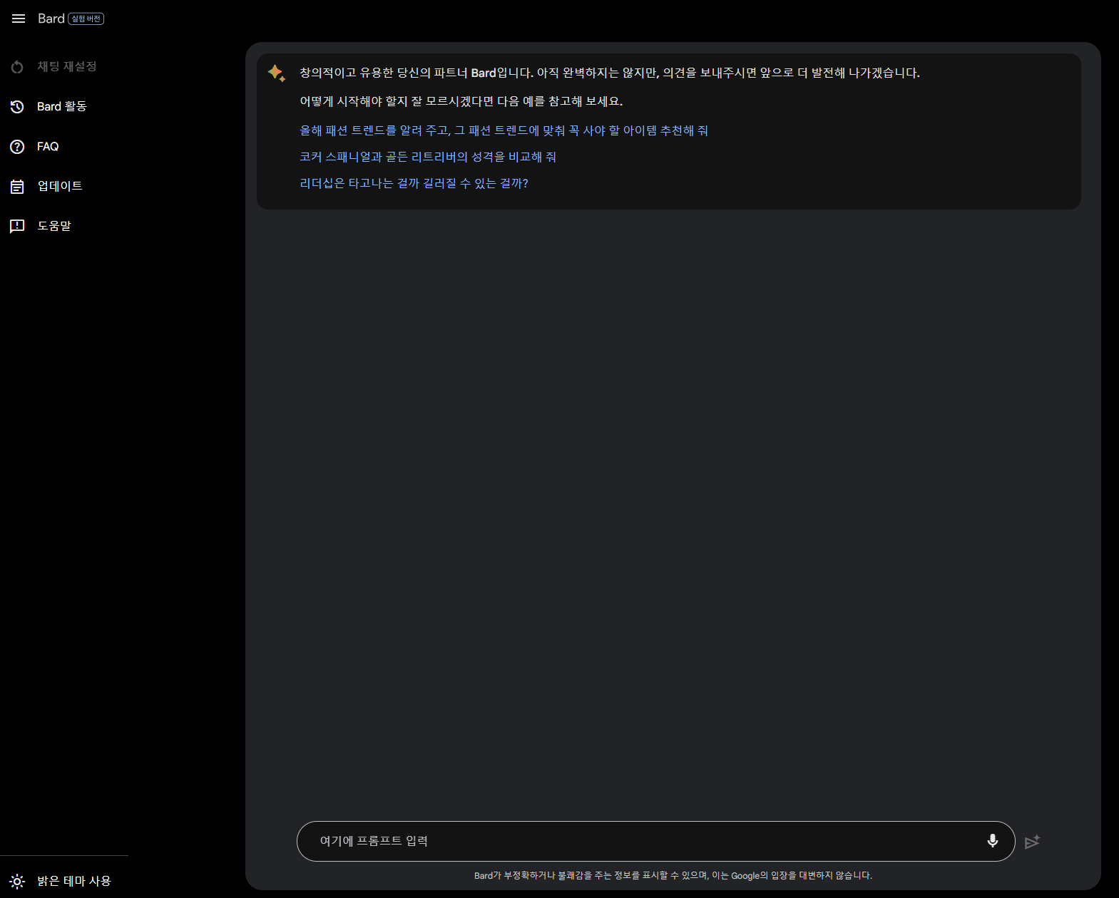 Google Bard는 대화형 AI, 정보 제공 및 포괄적으로 훈련된 챗봇이라고 하는 대규모 언어 모델입니다. 방대한 양의 텍스트 데이터에 대해 훈련을 받았으며 광범위한 프롬프트와 질문에 대한 응답으로 인간과 유사한 텍스트를 전달하고 생성할 수 있습니다. 인간과 유사하게 답변할 수 있지만 인간처럼 생각하거나 느낄 수 없기 때문에 인간 대신 전문적인 조언을 구해서는 안됩니다. 바드는 아직 개발 중인 AI 챗봇으로, 완벽하지 않으며 가끔 오해의 소지가 있는 정보를 제공할 수도 있습니다. 따라서 바드의 답변을 신뢰하거나 의학적, 법적, 재정적 또는 기타 중요한 결정들을 내리는 데 사용하는 것은 신중해야 합니다. 때때로 부정확하거나 부적절한 정보를 제공할 수도 있습니다. 인공지능은 인공지능일 뿐이라는 것을 꼭 기억하고 명심해야 할 것입니다.