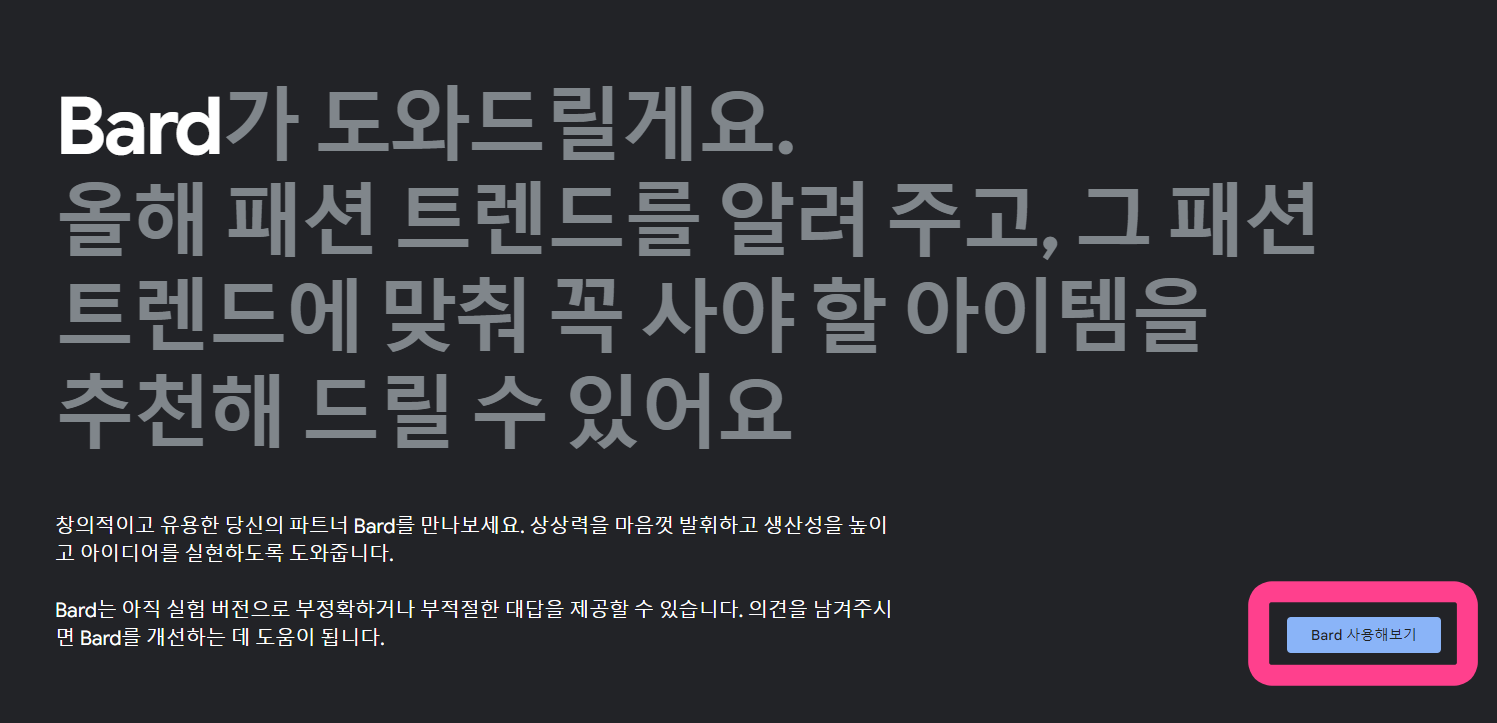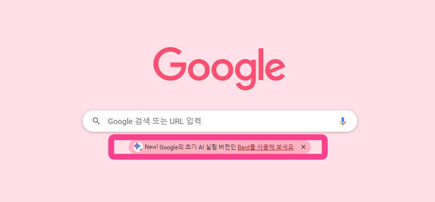 구글 검색 창을 열면 Bard 사용을 권유하는 내용이 포함되어 있습니다. 사실 이것만 보아도 구글이 바드에 얼마나 진심인지 알 수 있습니다. 밑줄 친 부분을 클릭하면 바드를 사용할 수 있는 페이지로 바로 이동합니다