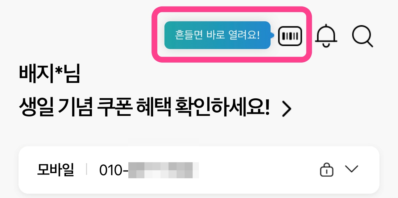 KT 멤버십 어플을 열고, 상단의 바코드 모양을 클릭하면 바코드가 뜹니다. 저는 편하게 바코드를 꺼내기 위해 흔들면 바로 열리도록 설정해 두었습니다.