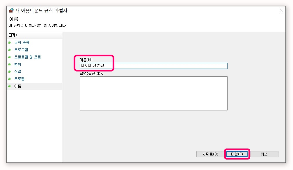 이제 마지막이에요! 이름 부분에 자신이 알 수 있도록 써주시면 되구요. 저는 34 IP를 차단했기 때문에 [아시아 34 차단]이라고 써넣었어요. 이름 부분 작성을 다하셨다면 마침 눌러주시면 됩니다