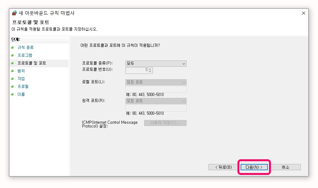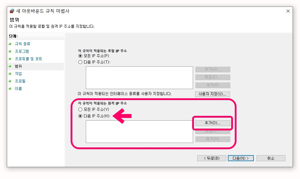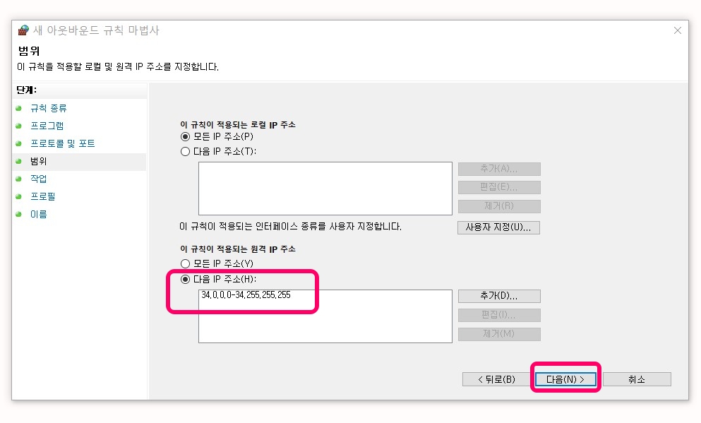 그러면 이런 창이 나타나게 될 거예요. 여기서 아래쪽에 있는 [이 규칙이 적용되는 원격 IP 주소]를 설정해줄 거예요
