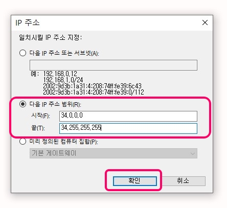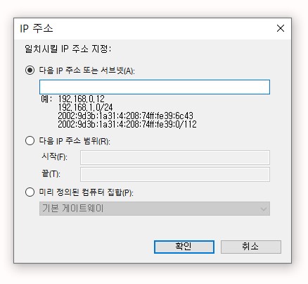 그러면 IP 주소를 입력하는 새창이 뜨고요. 우리는 IP 주소를 지정해줄 것이기 때문에 [다음 IP 주소 범위(R)]부분을 설정해줄 거예요.