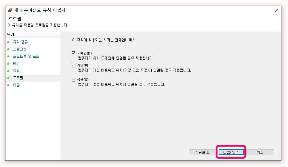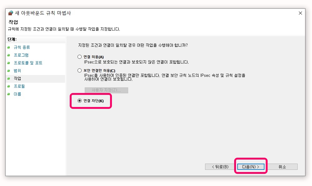 [연결 차단] 부분이 선택되어 있는지 확인하고[다음] 버튼을 눌러주세요