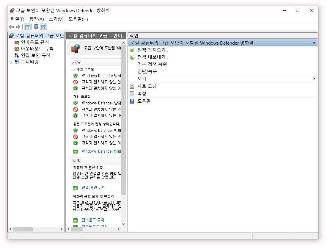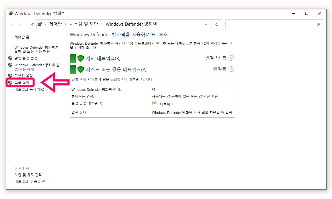방화벽 왼쪽의 [고급설정]을 눌러 들어가 주세요