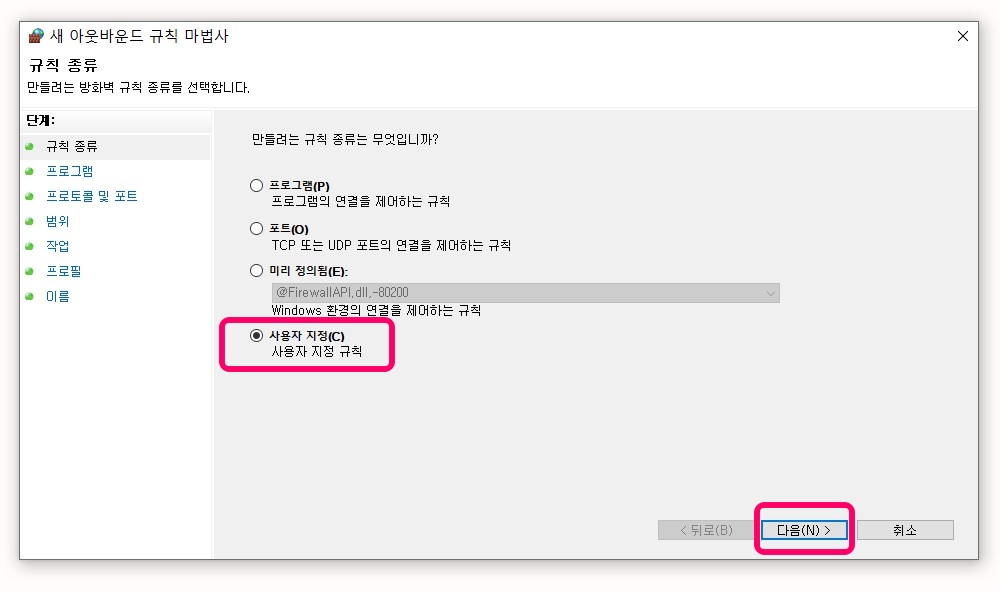 [사용자 지정] 선택해주시고[다음] 버튼 눌러주세요