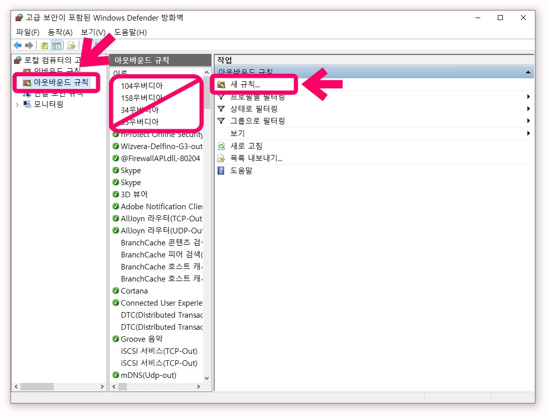 다른 건 아무것도 건드리지 말고 [아웃바운드 규칙] - [새 규칙]을 눌러주세요. 저는 이전 시즌에도 서버를 차단하였던 기록이 있어 [104 우버디아, 158 우버디아, 34 우버디아, 35 우버디아]라는 규칙들이 있지만, 처음 하시는 분들이라면 없는 것이 당연하니 당황하지 않으셔도 됩니다 :)