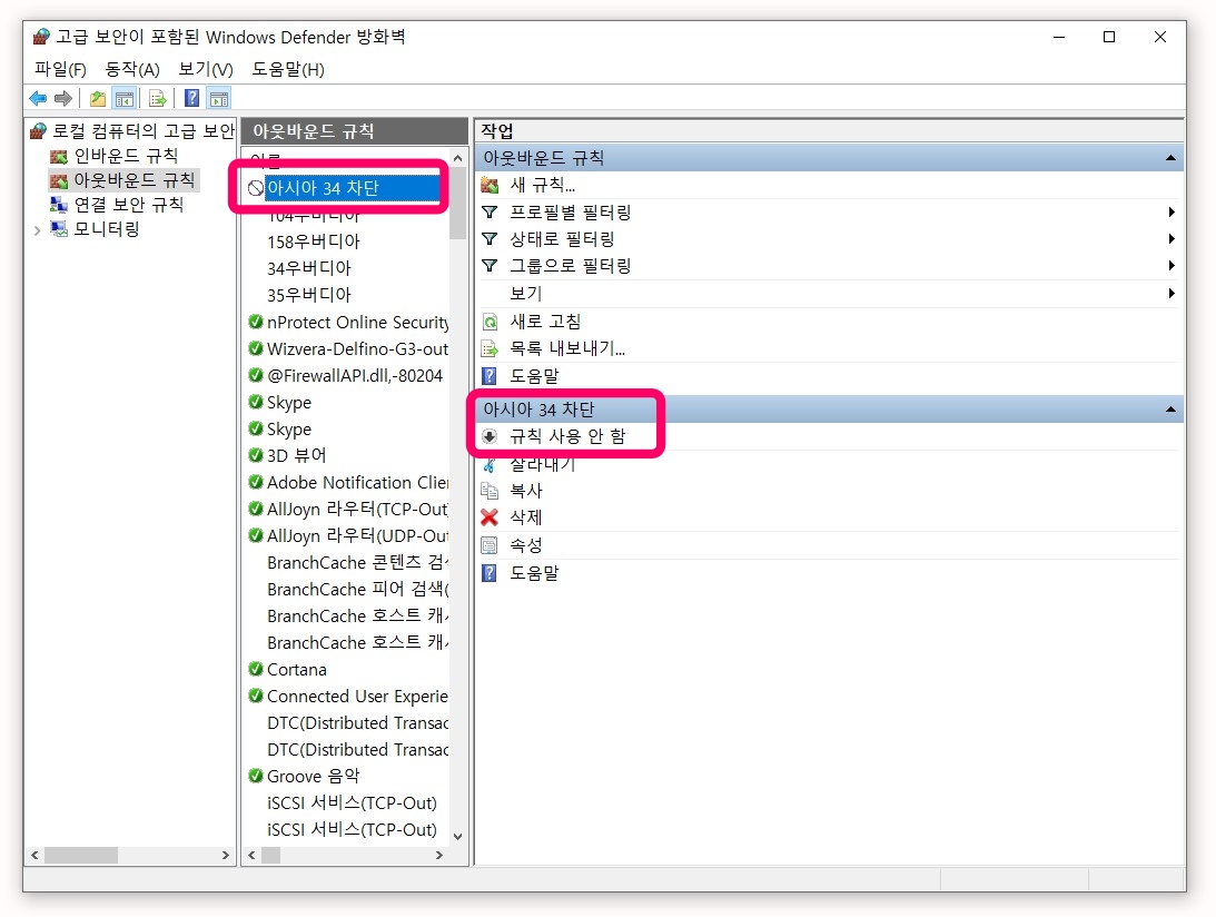 혹시라도, 차단한 IP를 풀고 싶다면 [아웃바운드 규칙] 창에서 [아시아 34 차단]을 클릭한 후 오른쪽에 보시면 [규칙 사용 안 함]이라는 버튼을 클릭해서 풀어주시면 됩니다. 다시 사용하게 된다면 [규칙 사용]으로 변경해주시면 되겠죠?