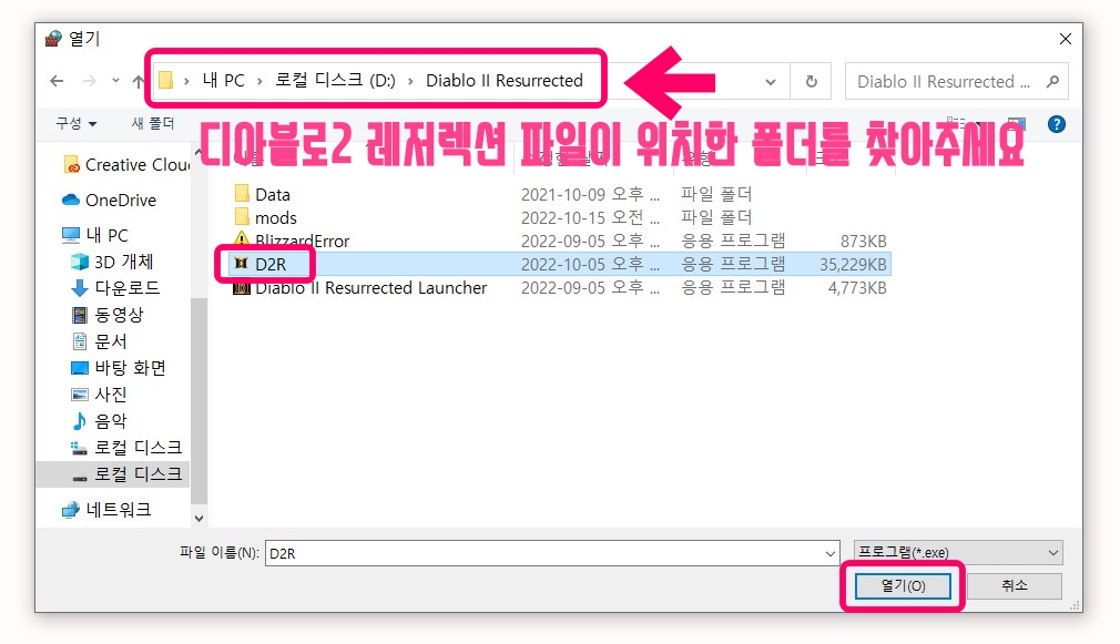 그러면 파일을 찾아야 하는데요. 자신이 설치한 디아블로 2 레저렉션 파일이 어디에 위치해 있는지 찾아주셔야 합니다. 저는 D드라이브에 깔아놓았고요. 대부분 C드라이브에 많이 설치하셨을 거예요. [D2R]이라는 응용프로그램을 찾아서 열어주시면 돼요