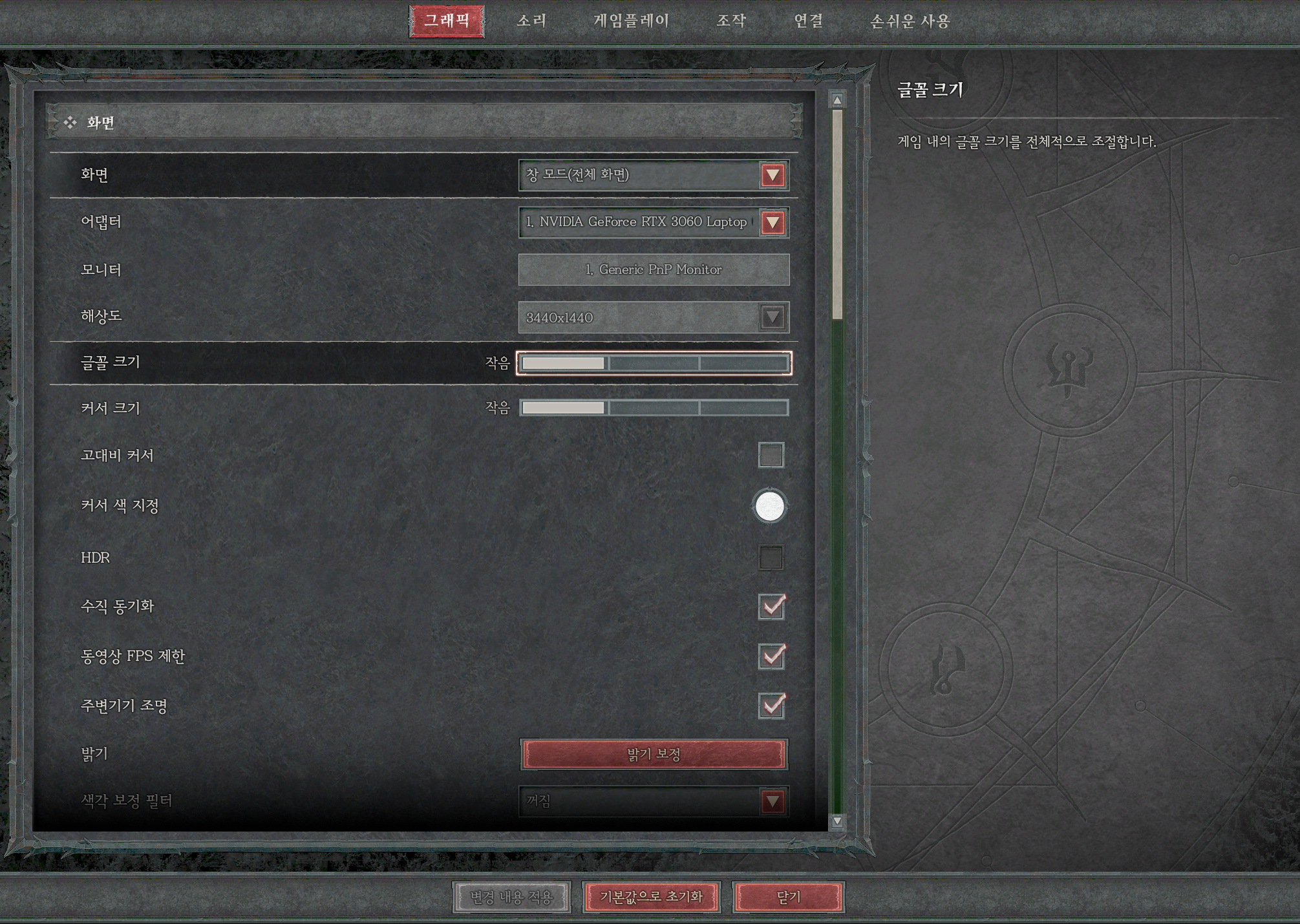 디아 4 게임 내 [설정] > [그래픽]으로 들어가서 글꼴 크기가 [작음]으로 설정되어 있는지 확인한 후, 이를 [중간]으로 변경하고 변경 내용을 적용해 주면 패드 사용자도 배틀패스 시즌보상을 수령할 수 있습니다.